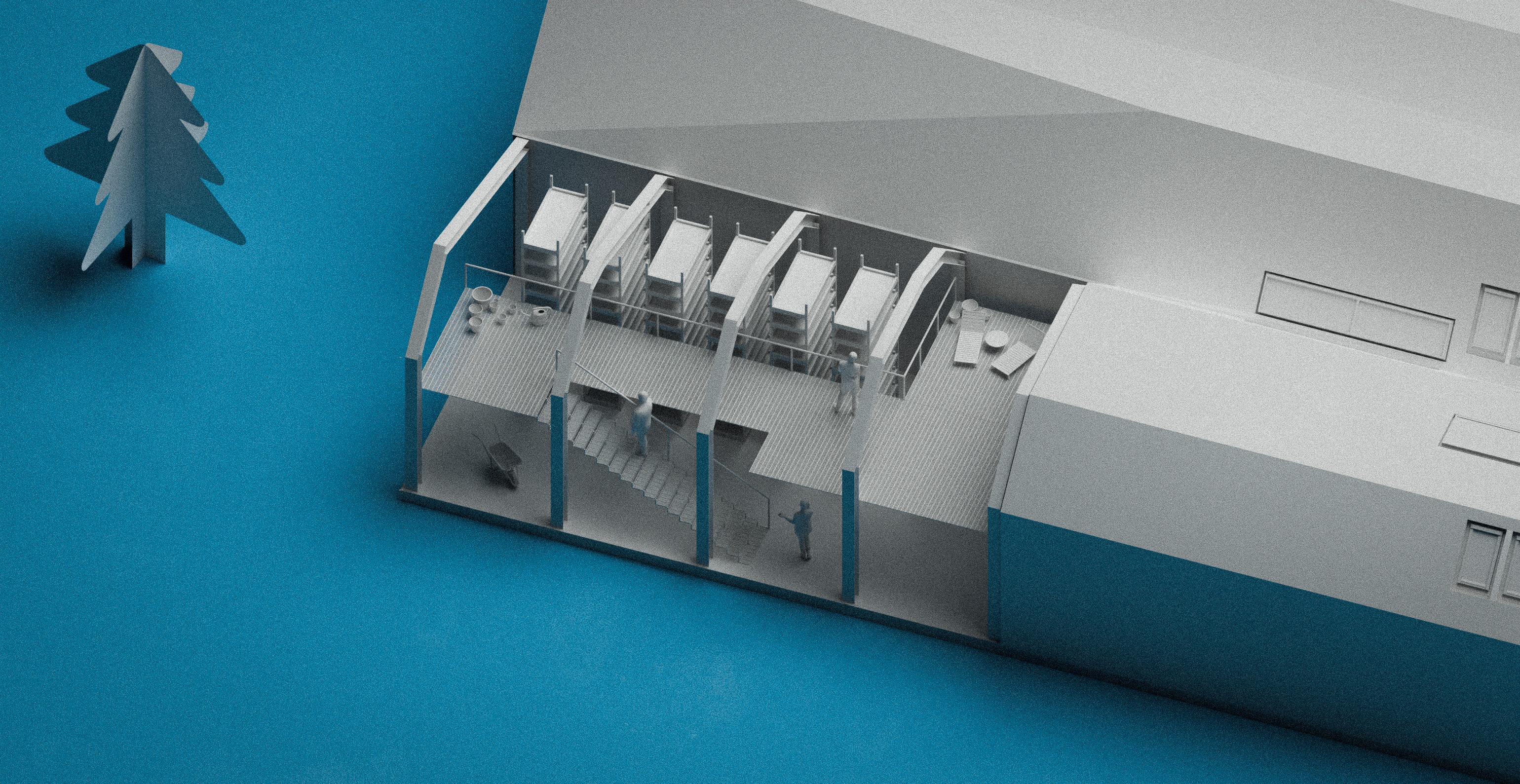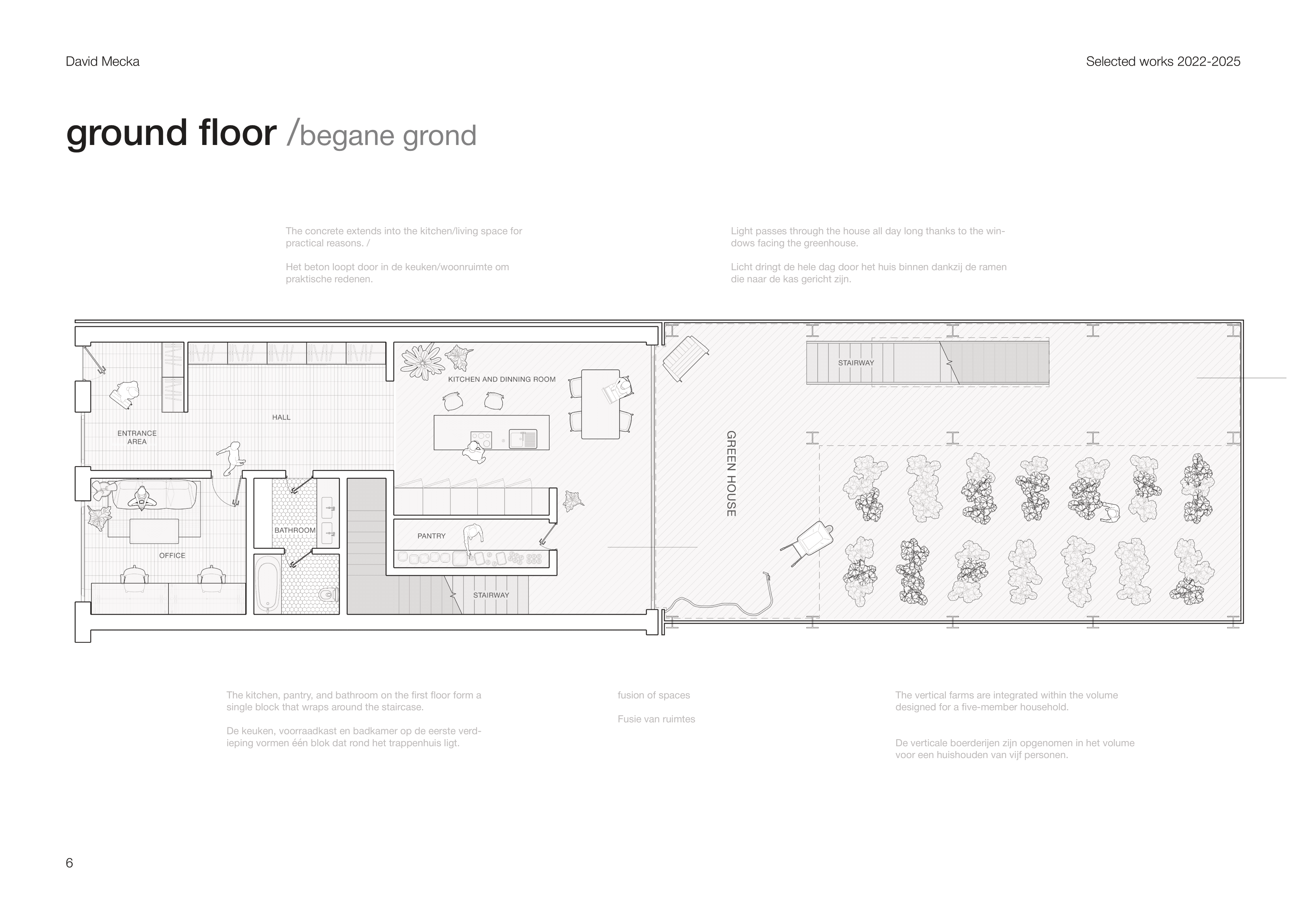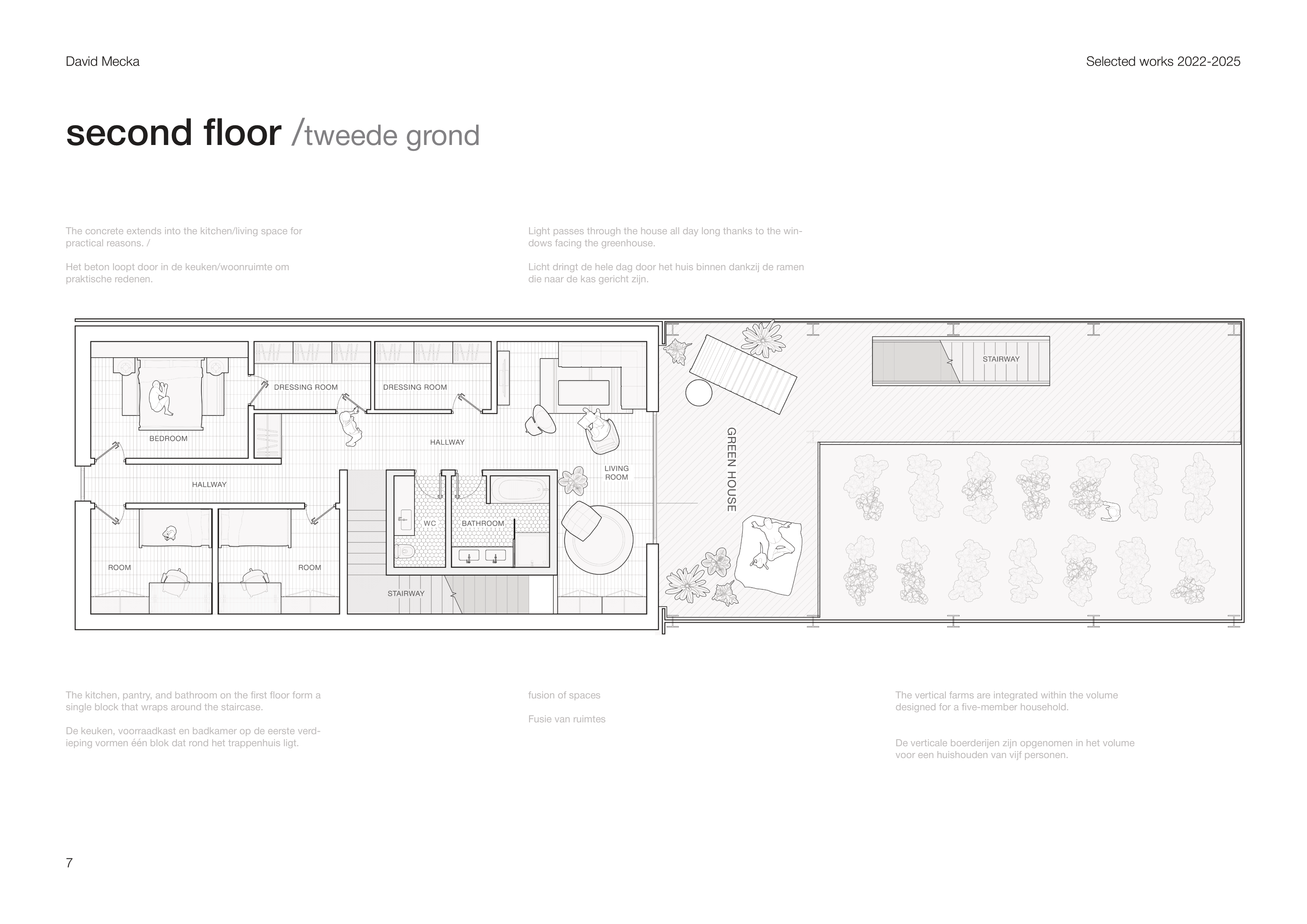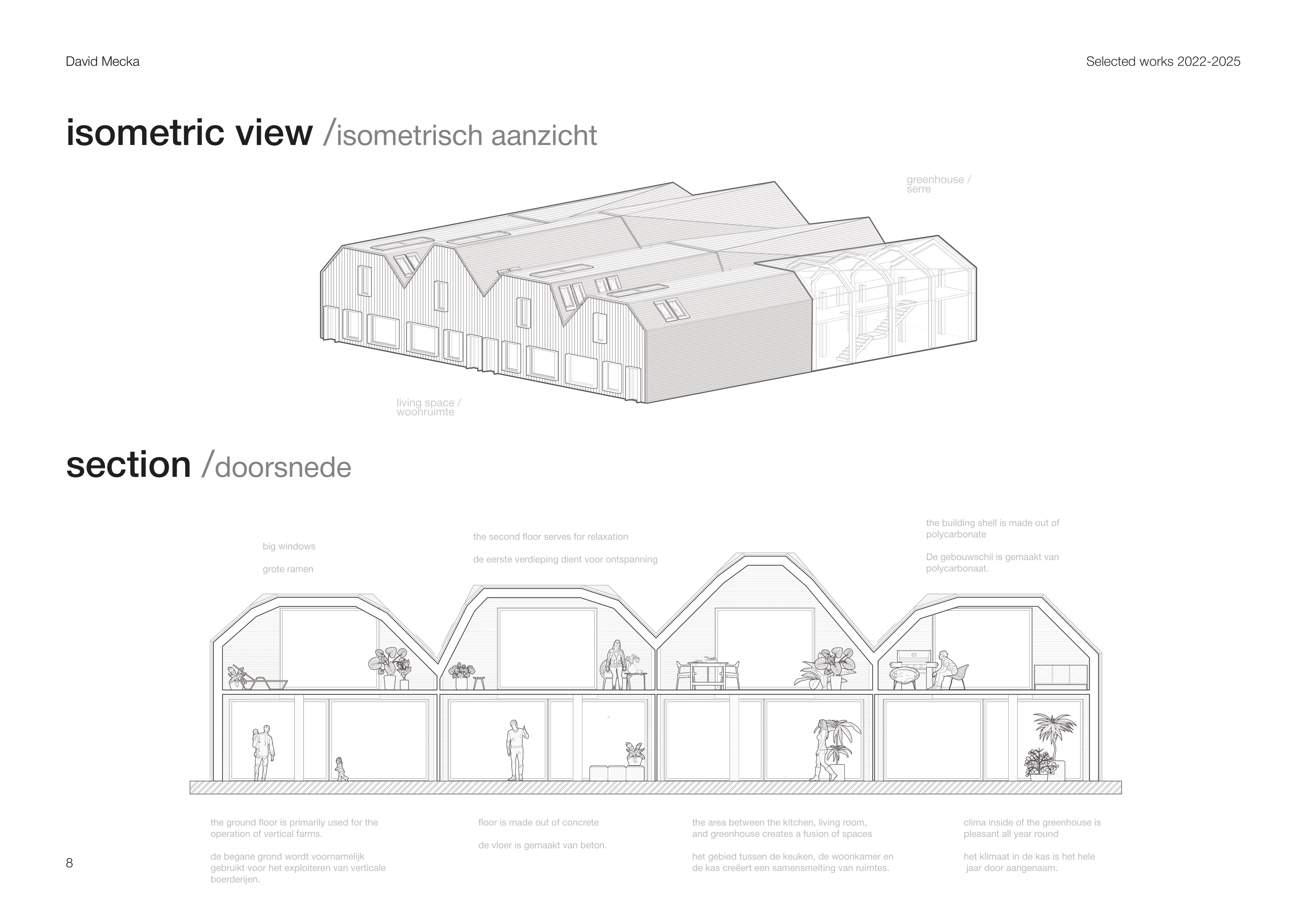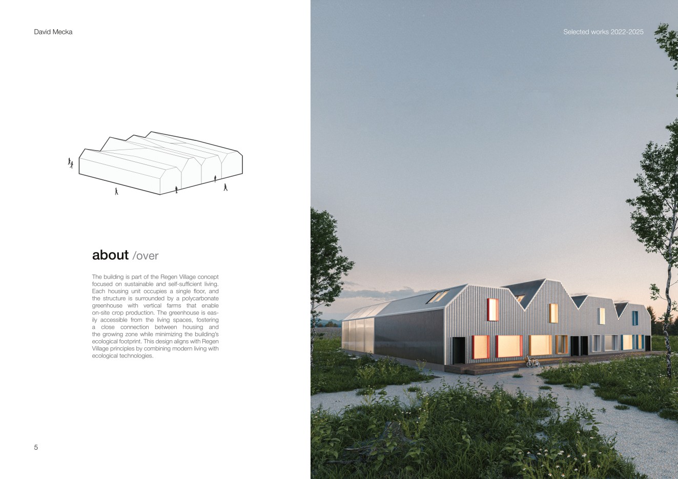 The building is part of the Regen Village concept, focused on sustainable and self-sufficient living. Each residential unit has a single floor, and the building is surrounded by a polycarbonate greenhouse with vertical farms to support on-site crop cultivation. The greenhouse is easily accessible from the living spaces, fostering a connection between the residential area and the growing zone, while minimizing the building's ecological footprint. This design aligns with Regen Village principles, combining modern housing with eco-friendly technologies.
